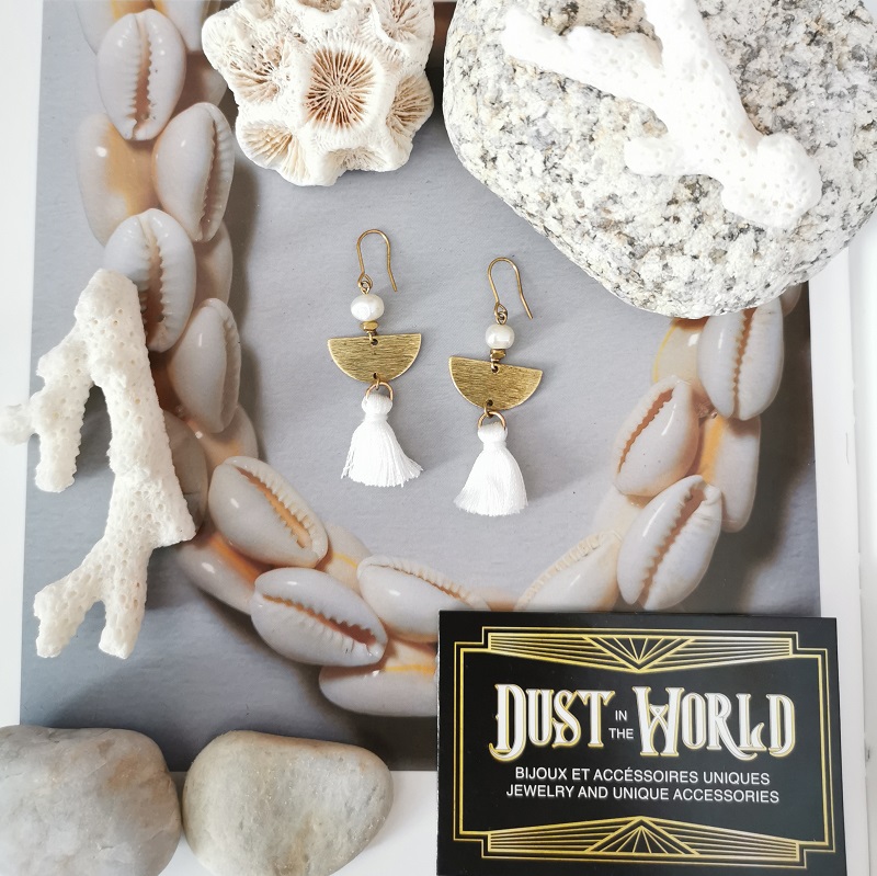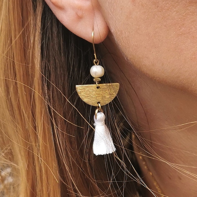 Cette paire de boucles d’oreilles lagon demi-lune est composée de perles blanches d’eau douce de rivière, de plaques brossées en laiton doré en forme de demi-lune & finies d’un pompon blanc.