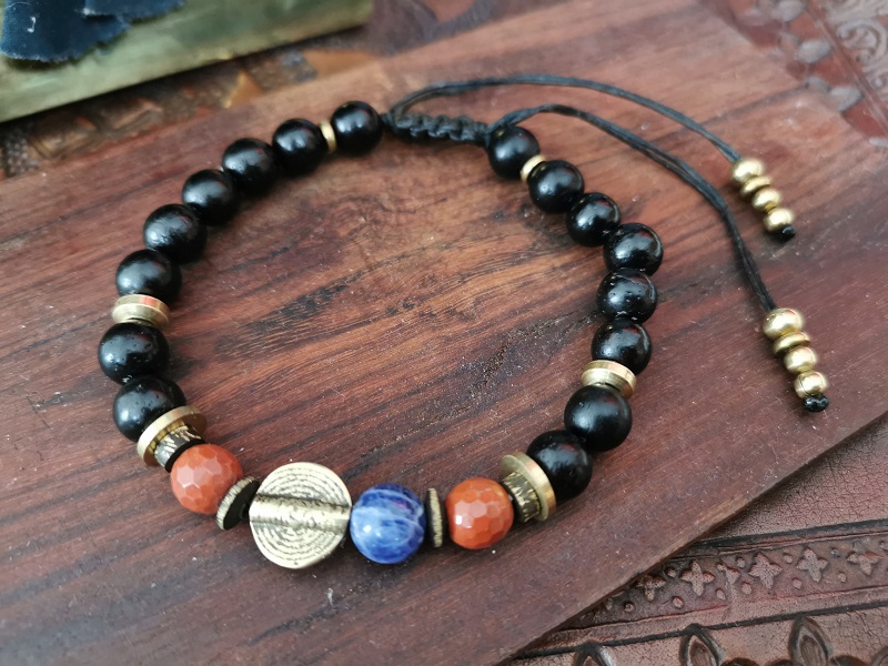 Le bracelet est composé de pierres naturelles de Jaspe rouge et sodalite, accompagné de perles de bronze et bronze ancien.