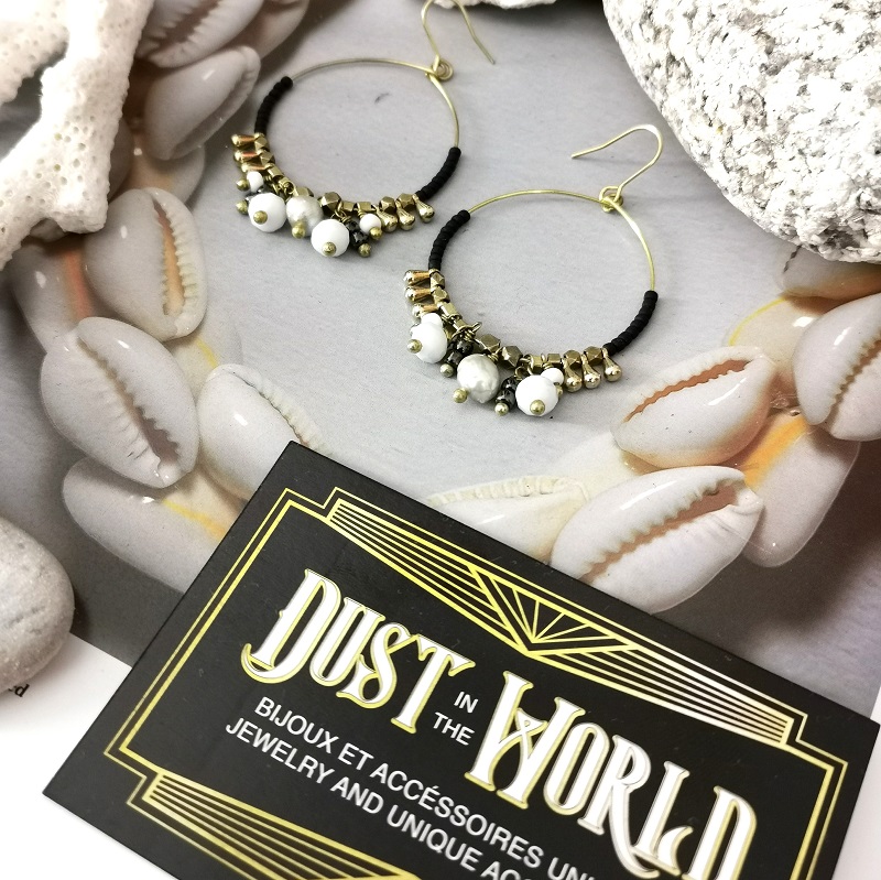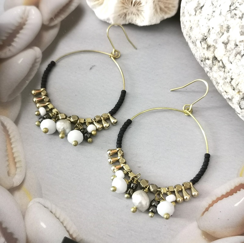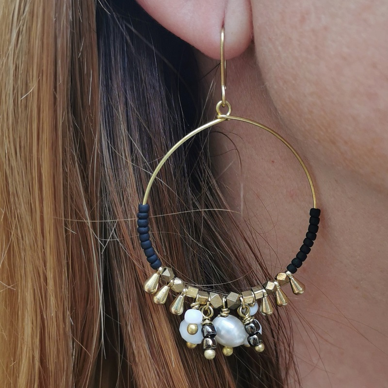 Ces créoles sont de taille moyenne, composées de perles de culture grise de rivière, de fines perles de Miyuki noires et de pampilles en laiton dorés.