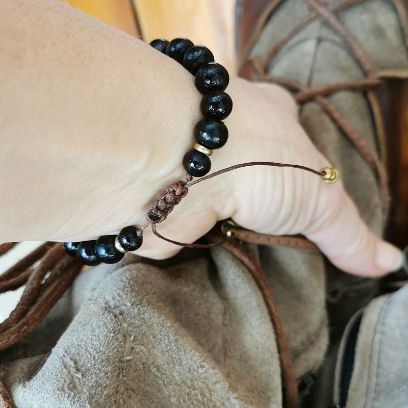 Perles noires en Eben ou marron de bois naturel, le tout vernis.